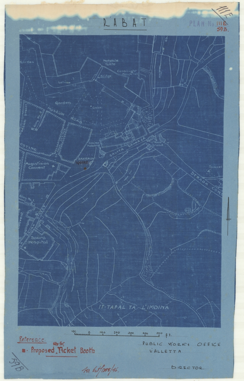 Blueprint of a map of Rabat showing in red the proposed site bus ticket booth in Sakkajja Square.