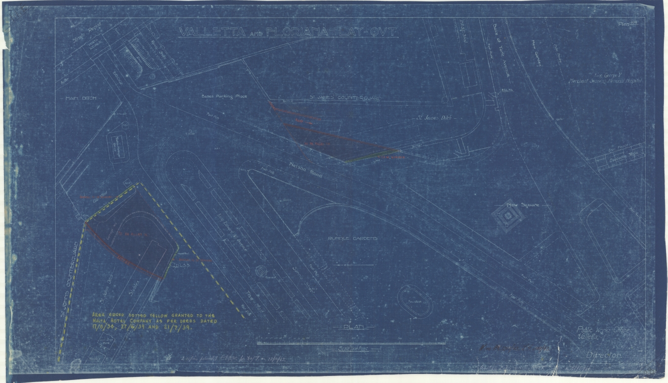 Blueprint of a plan of Valetta and Floriana showing in red the areas to be modified adjacent to St.James counterguard and in yellow dotted line the land granted to the Malta Hotel Company as per deeds dated 17-8-36, 27-6-39 and 21-7-39