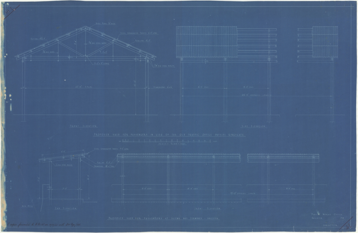Blueprint of plan of proposed shed for passengers in lieu of the old traffic office outside Kingsgate and proposed shed for passengers at Sliema bus terminus in Valletta