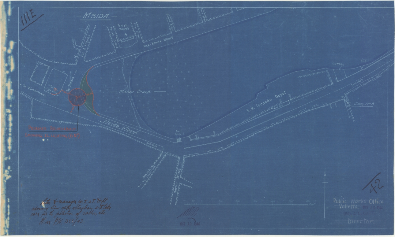 Blueprint of plan showing the proposed roundabout in Msida wharf