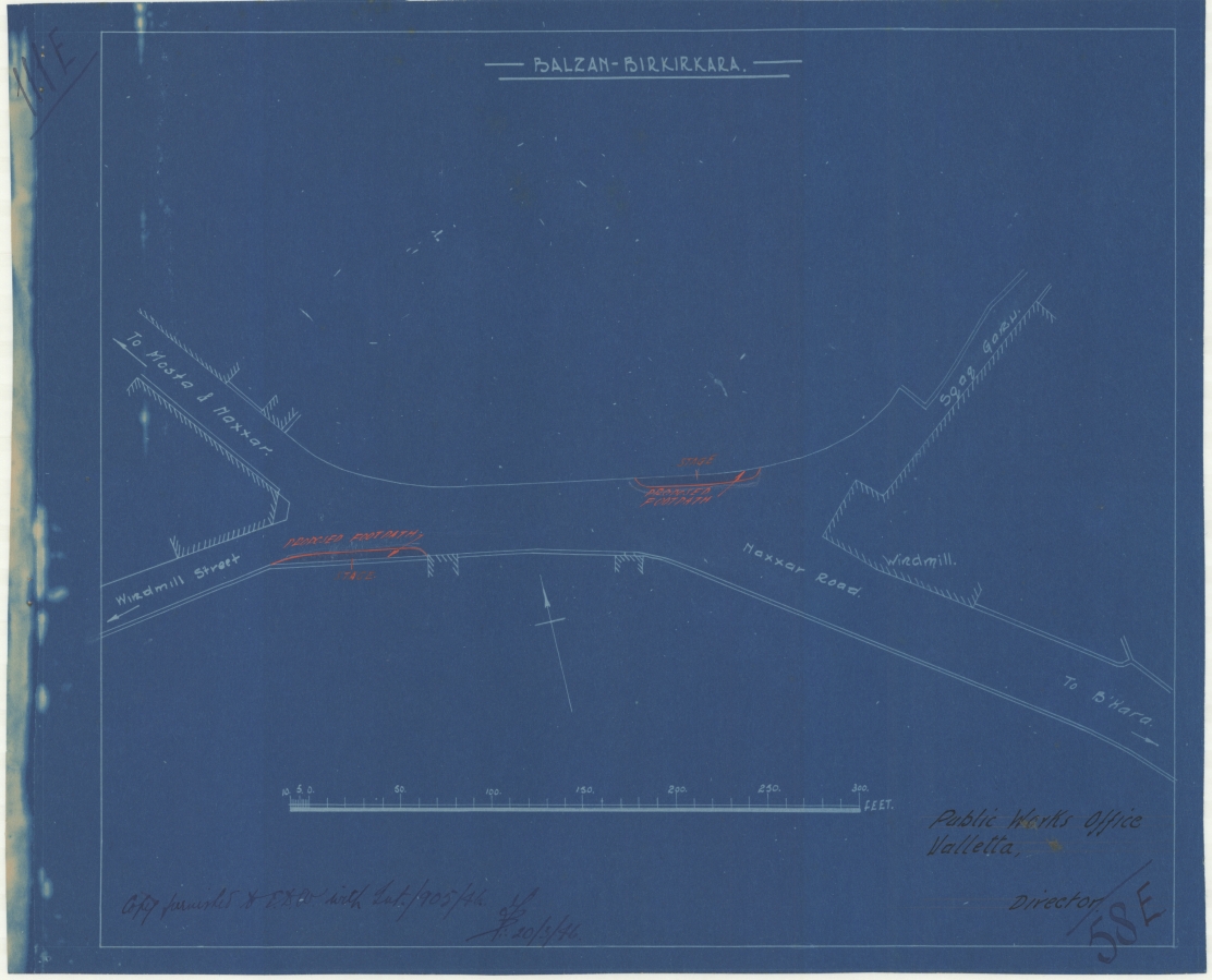 Blueprint showing in red the proposed position of footpath and bus stages in Naxxar road in Birkirkara.
