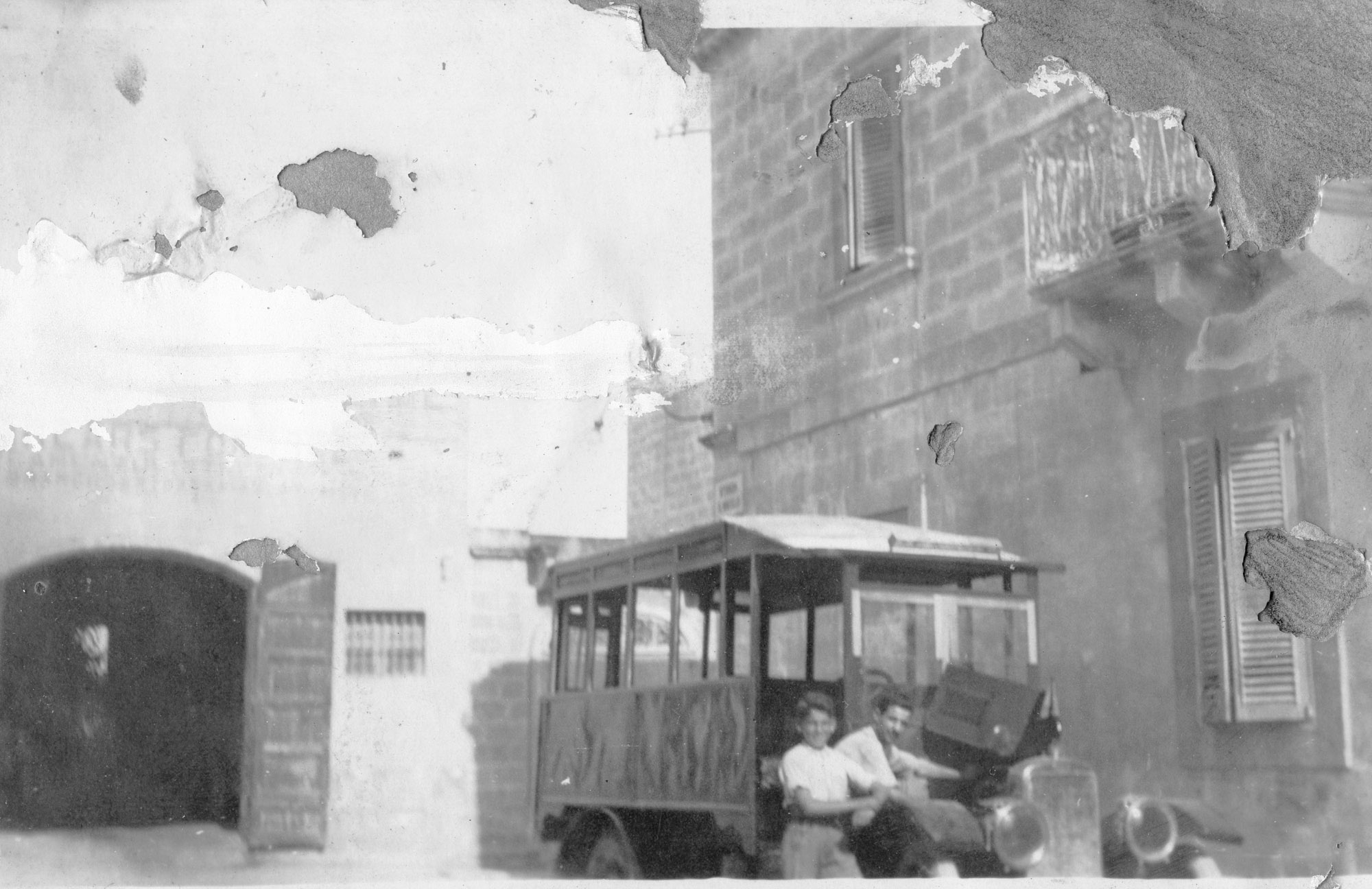 Sunbeam bus 1290, built by the Griscti Brothers of the Red Wheel Garage in Camenzuli Street, Sliema. The bus is nearly complete and one of the Griscti brothers is seen with an unknown boy by the bus (note the original of this image was heavily damaged)