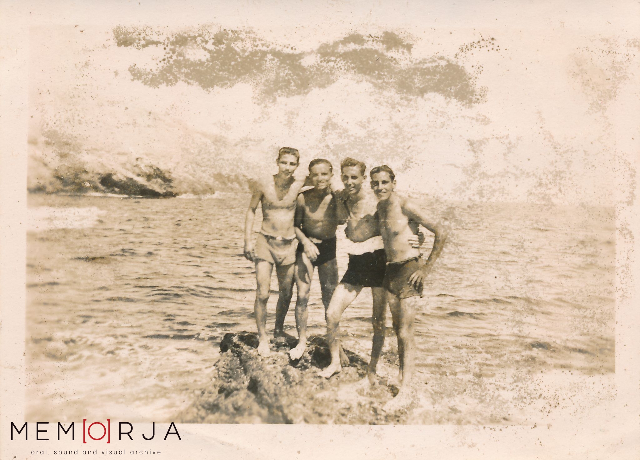 (From left) Tommy Seychell, Edgar Pace, Frankie Camilleri (with white towel) and Vincent 'Censinu' Caruana. Censinu, Tommy and Frankie were refugees from the inner harbour area and Edgar was from Siggiewi. The latter was also interviewed for the theme 'Experiencing War'.