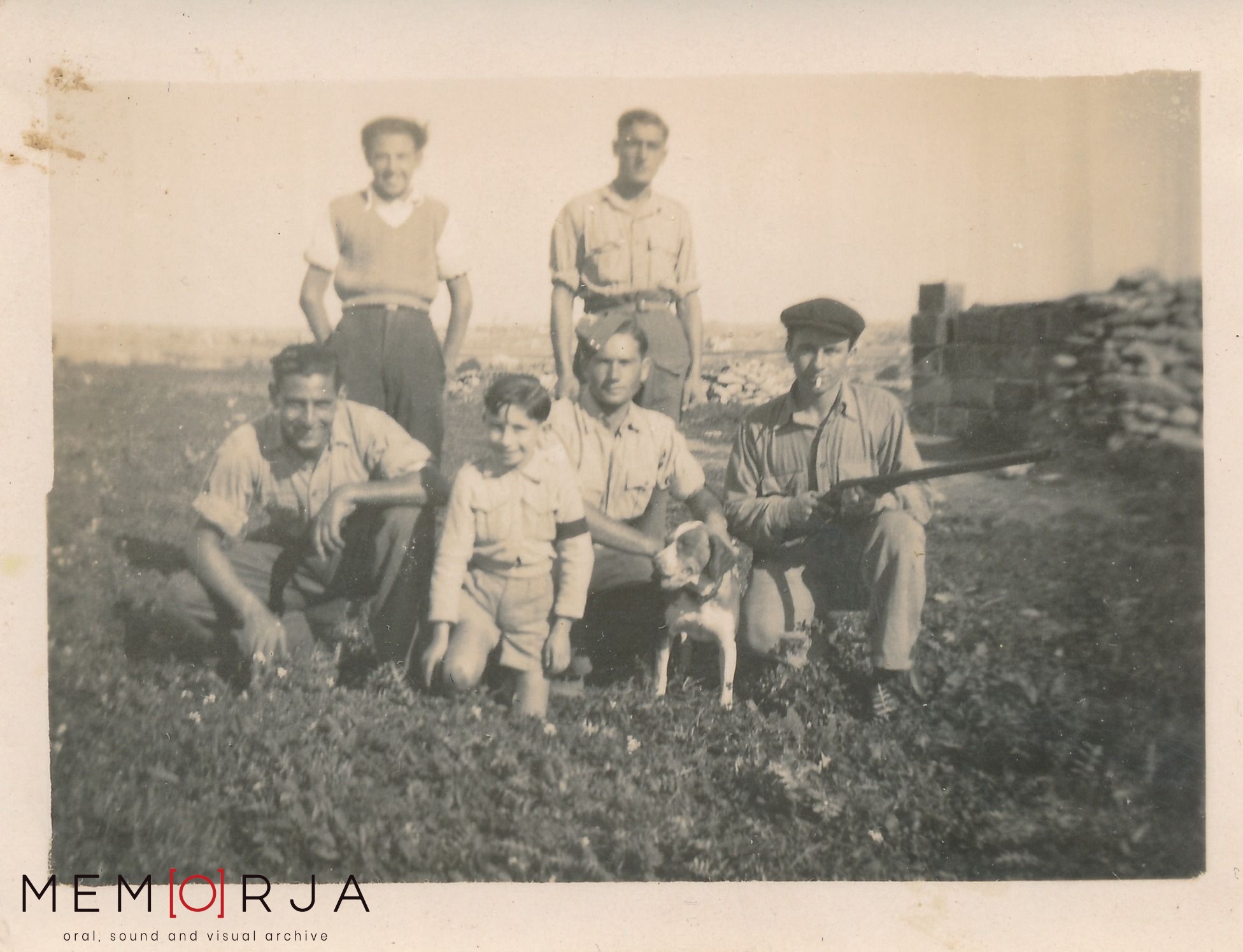 Gunner Vincent 'Censinu' Caruana (crouching, first from left), Sergeant Anglu Azzopardi (crouching, holding dog), Gunner Joseph Psaila (standing, centre) with two hunters and boy.