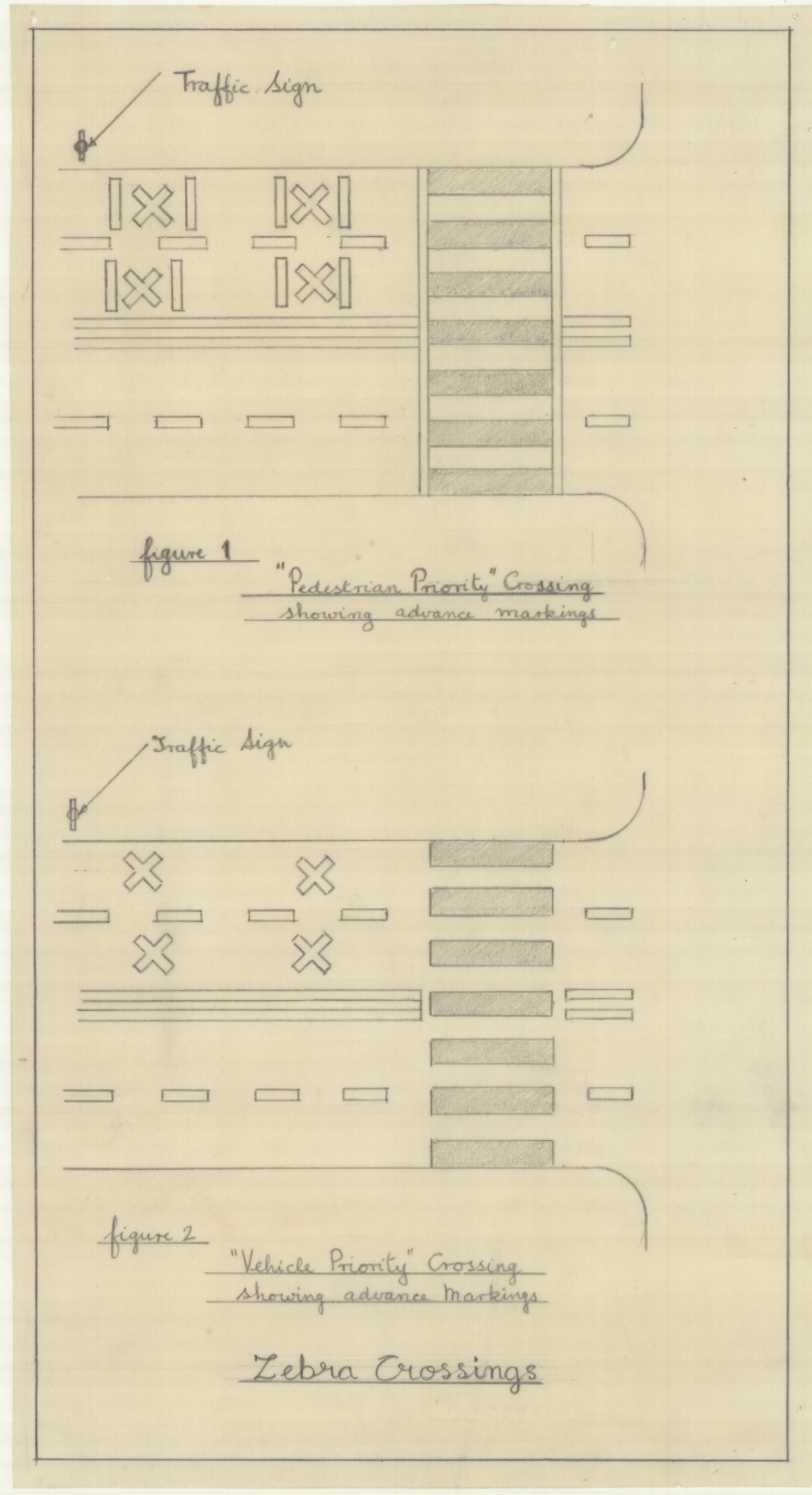 Drawing showing the proposed types of zebra crossings: pedestrian priority crossings and vehicle priority crossings, both showing advance markings