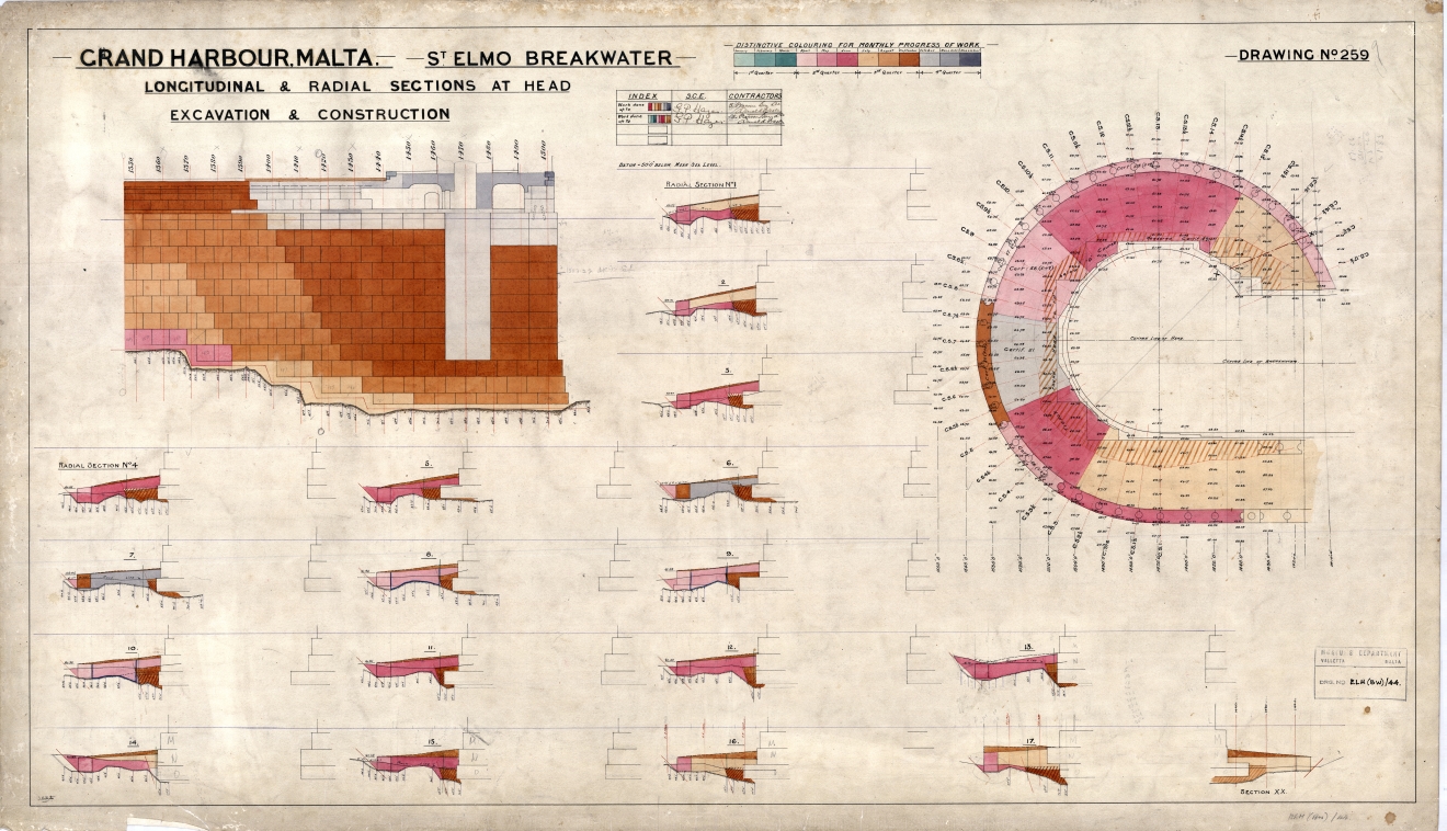 Grand Harbour, Malta - St Elmo Breakwater - Longitudinal & Radial Sections at Head - Excavation & Construction
