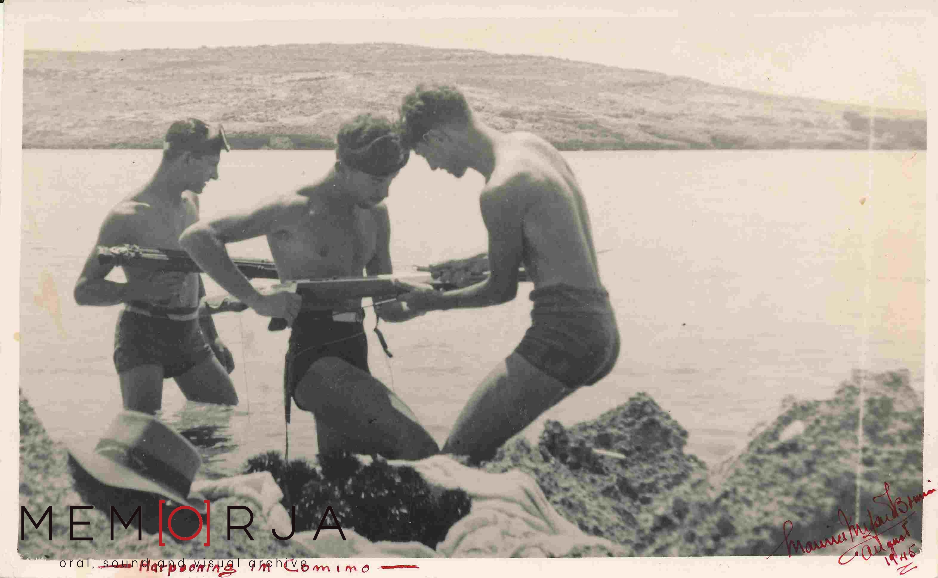 (From left) Johnny Camilleri, Antoine and Maurice Mifsud Bonnici harpooning in Comino.