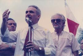 Prime Minister Karmenu Mifsud Bonnici addressing a crowd during a Malta Labour Party political meeting. Maurice Mifsud Bonnici is on the right while Minister Freddie Micallef is on the left.