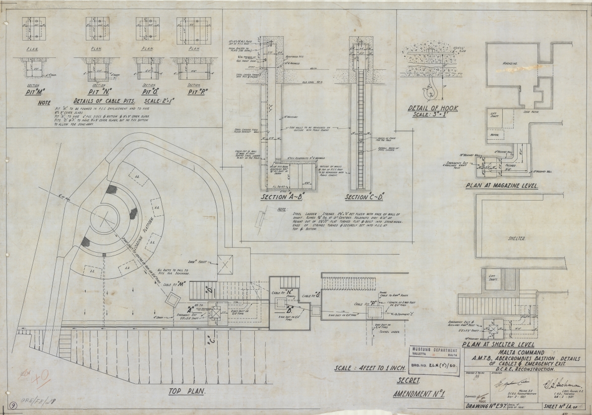 Malta Command - "F" (in pencil) A.M.T.B. - Abercombies Bastion - Details of Cables & Emergency Exit - D.C.R.E. Reconstruction