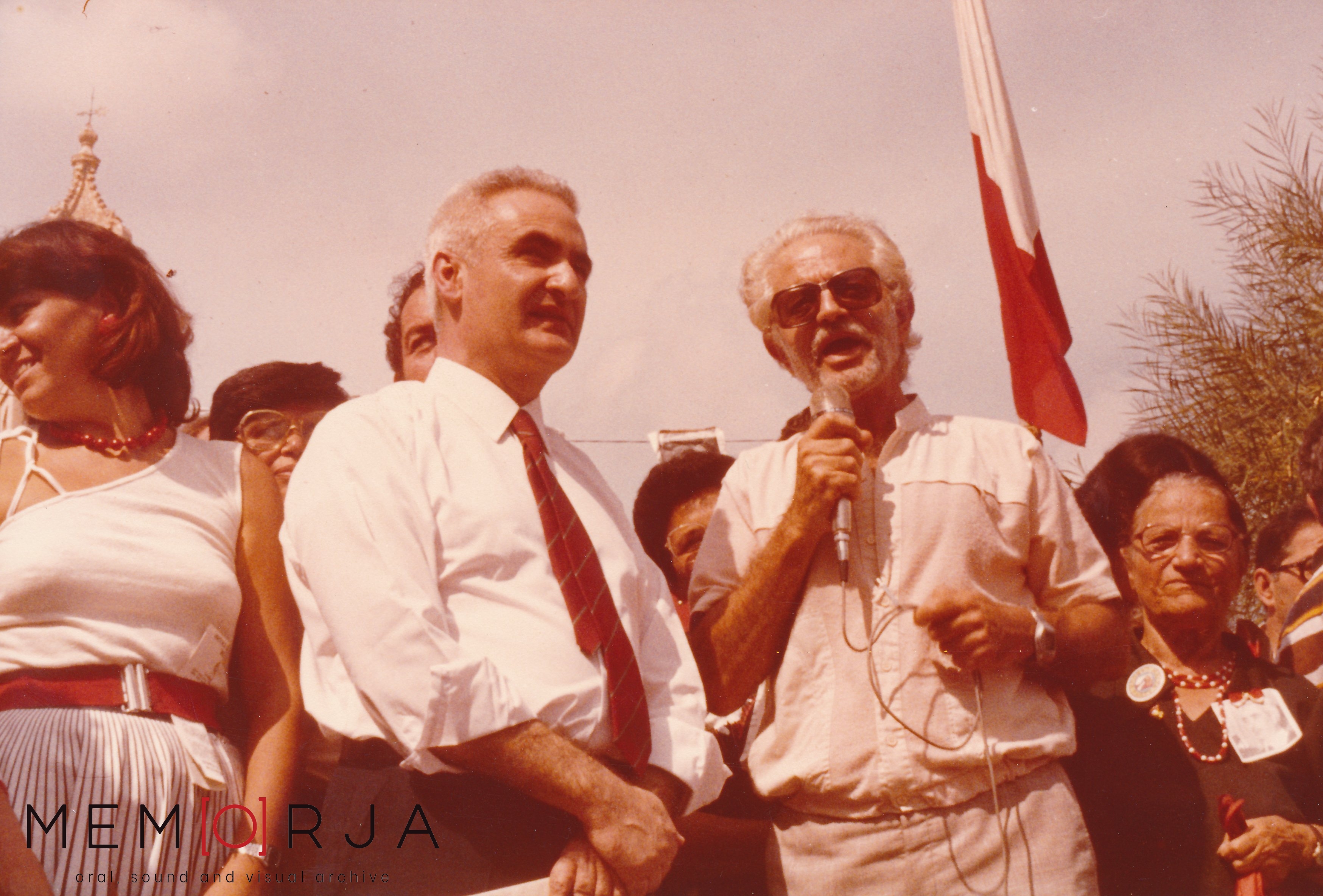 Maurice Mifsud Bonnici with Prime Minister Karmenu Mifsud Bonnici addressing a crowd of Malta Labour Party supporters.