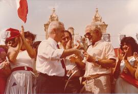 Maurice Mifsud Bonnici and Prime Minister Karmenu Mifsud Bonnici shaking hands during a Malta Labour Party political meeting. Minister Freddie Micallef is standing between them.