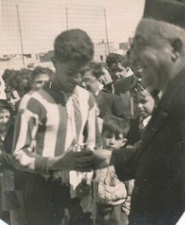 Maurice Mifsud Bonnici being presented a trophy by Fr Envin Busuttil, known by students as "Buzaqq".