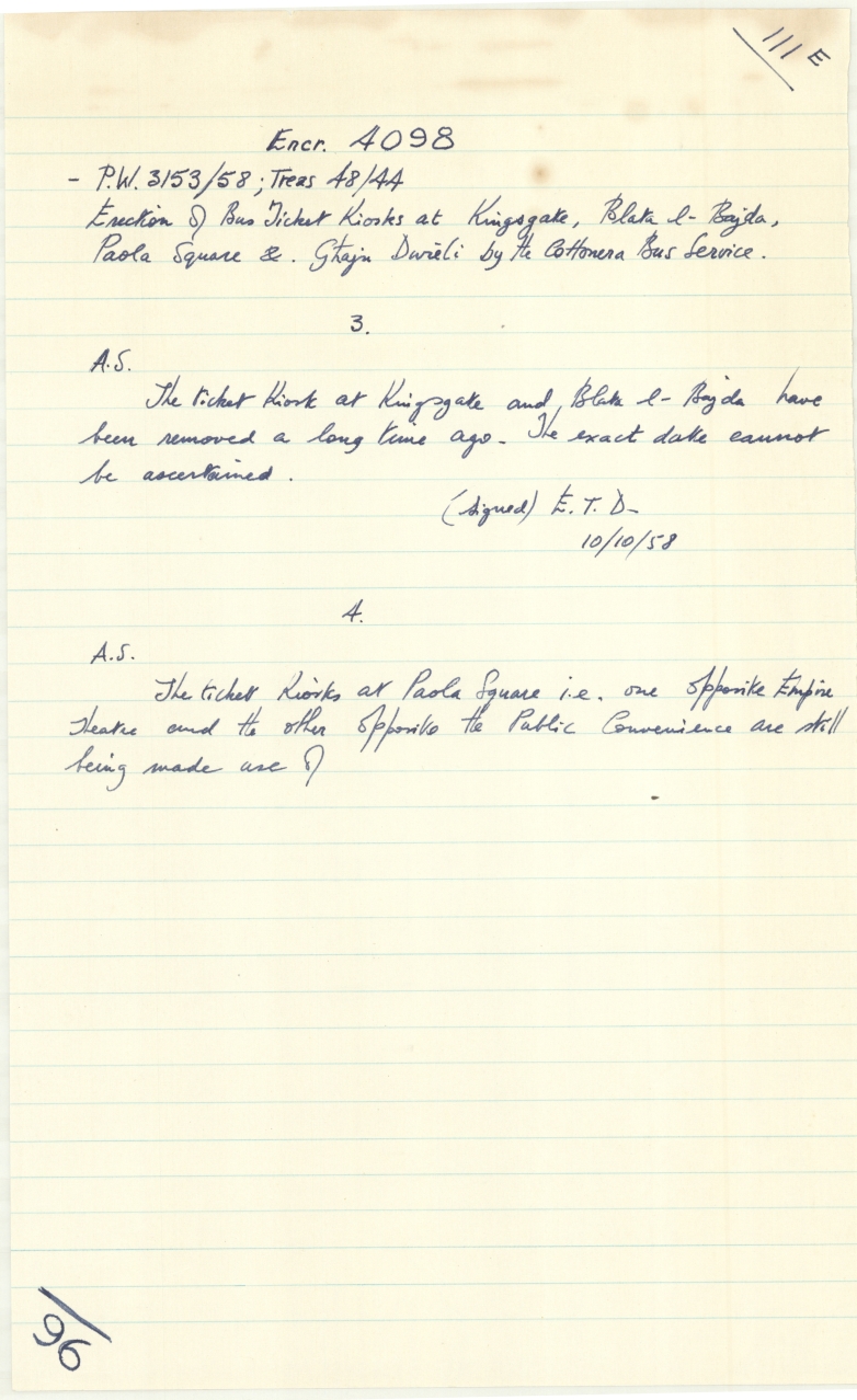 Item 63639 - Minute sheet for file referring to erection of ticket kiosks in various locations