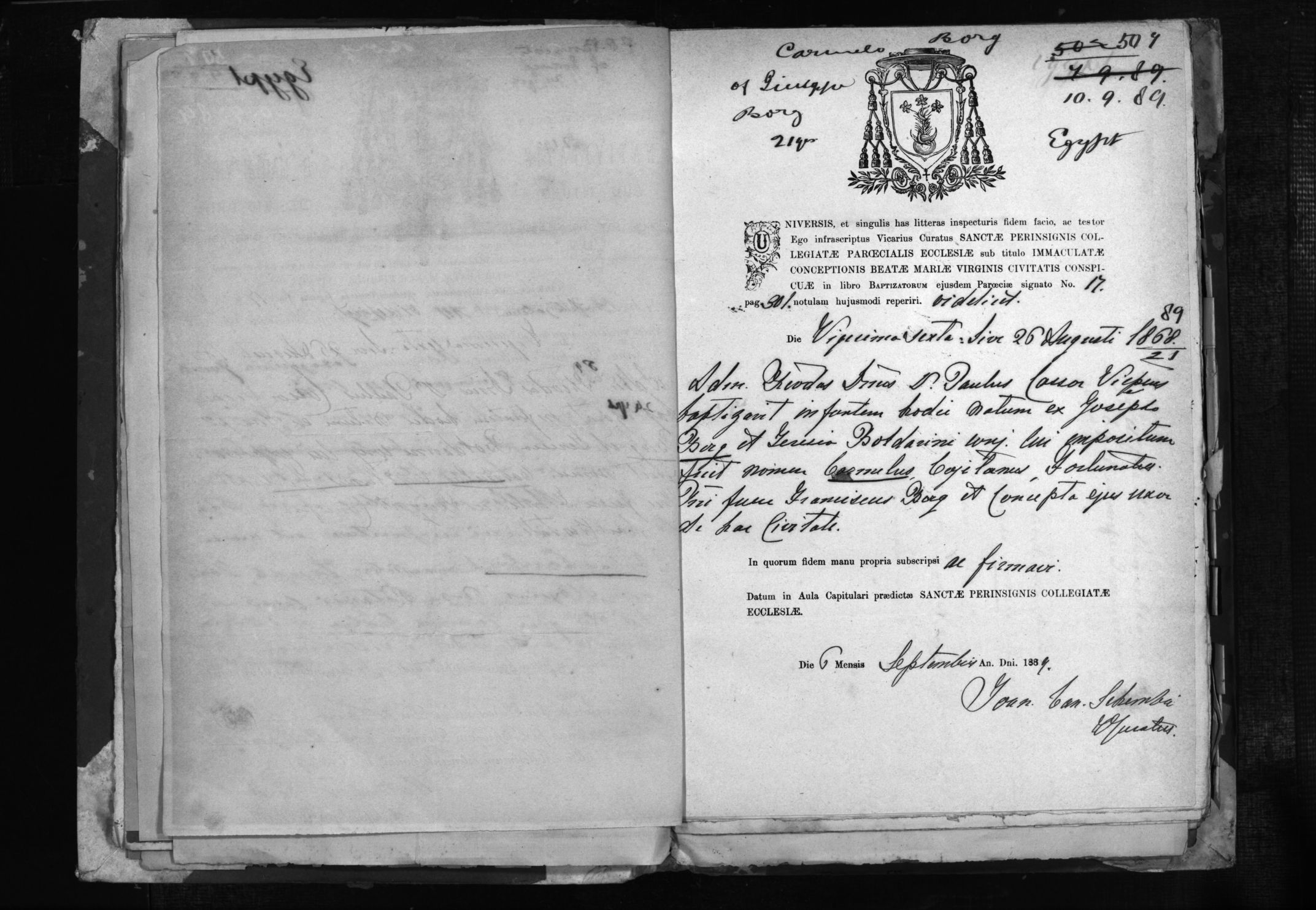 Son of Giuseppe, DOB 26/08/1868, Age 21, Occupation not stated, Town, Village, Parish Cospicua, Destination Egypt, Remarks