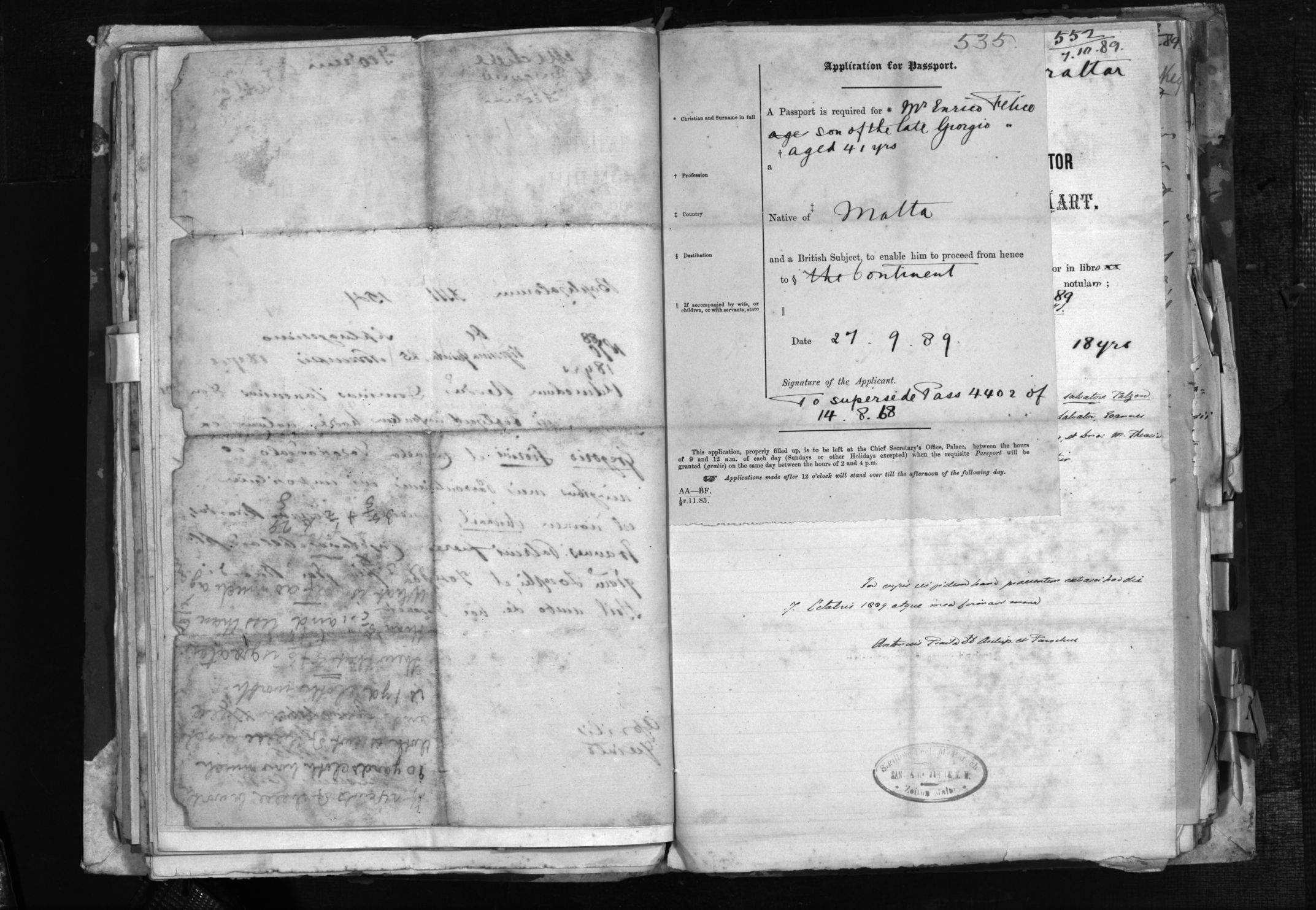Passport Application of Felice Enrico
