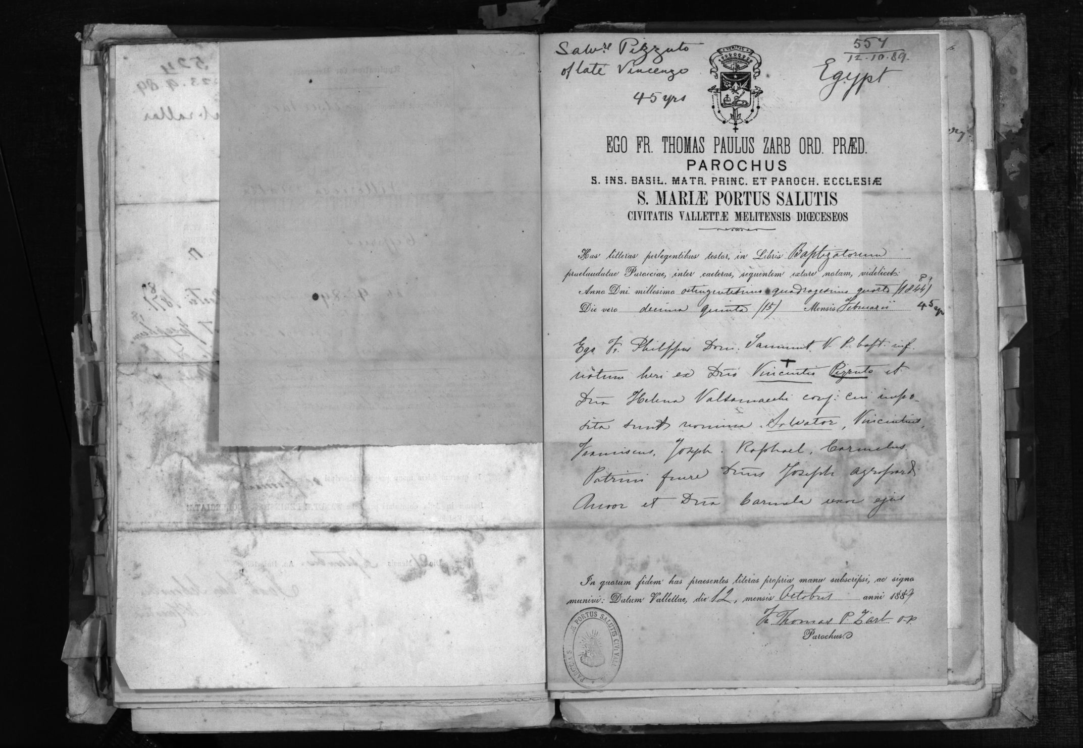 Son of Vincenzo, DOB 15/02/1844, Age 45, Occupation not stated, Town, Village, Parish Valletta, Destination Egypt, Remarks