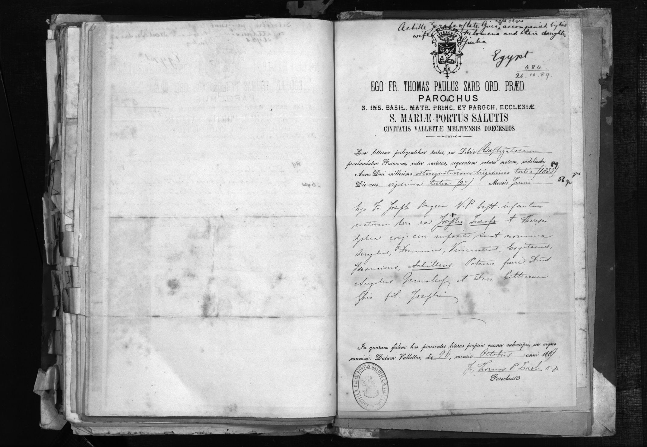 Son of the late Giuseppe, DOB 23/06/1833, Age 56, Occupation not stated, Town, Village, Parish Valletta, Destination Egypt, Remarks: Accompanied by his wife Filomena and his daughter Giulia