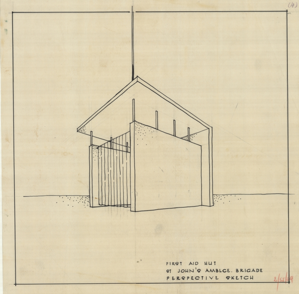 Perspective sketch of St. John s Ambulance Brigade, first aid hut.
