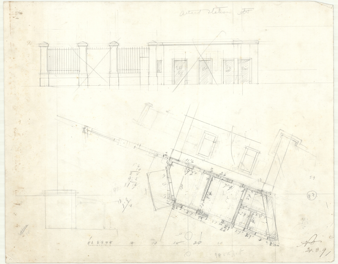 Plan and elevation of the proposed railway station in Attard