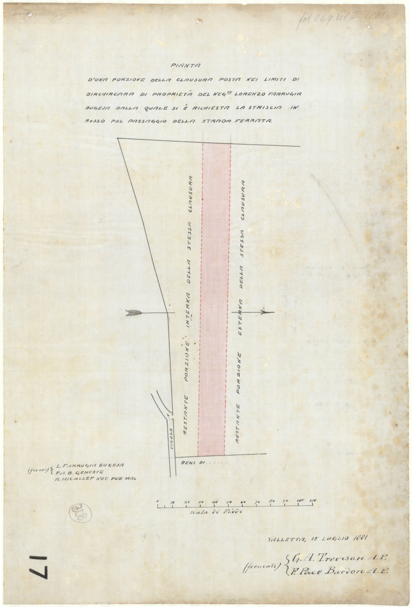 Plan of a portion of land holdings at the limits of Birchircara, owned by Mr. Lorenzo Farrugia Bugeja, of which a part has been requested, shown in red, for the laying of rail line.