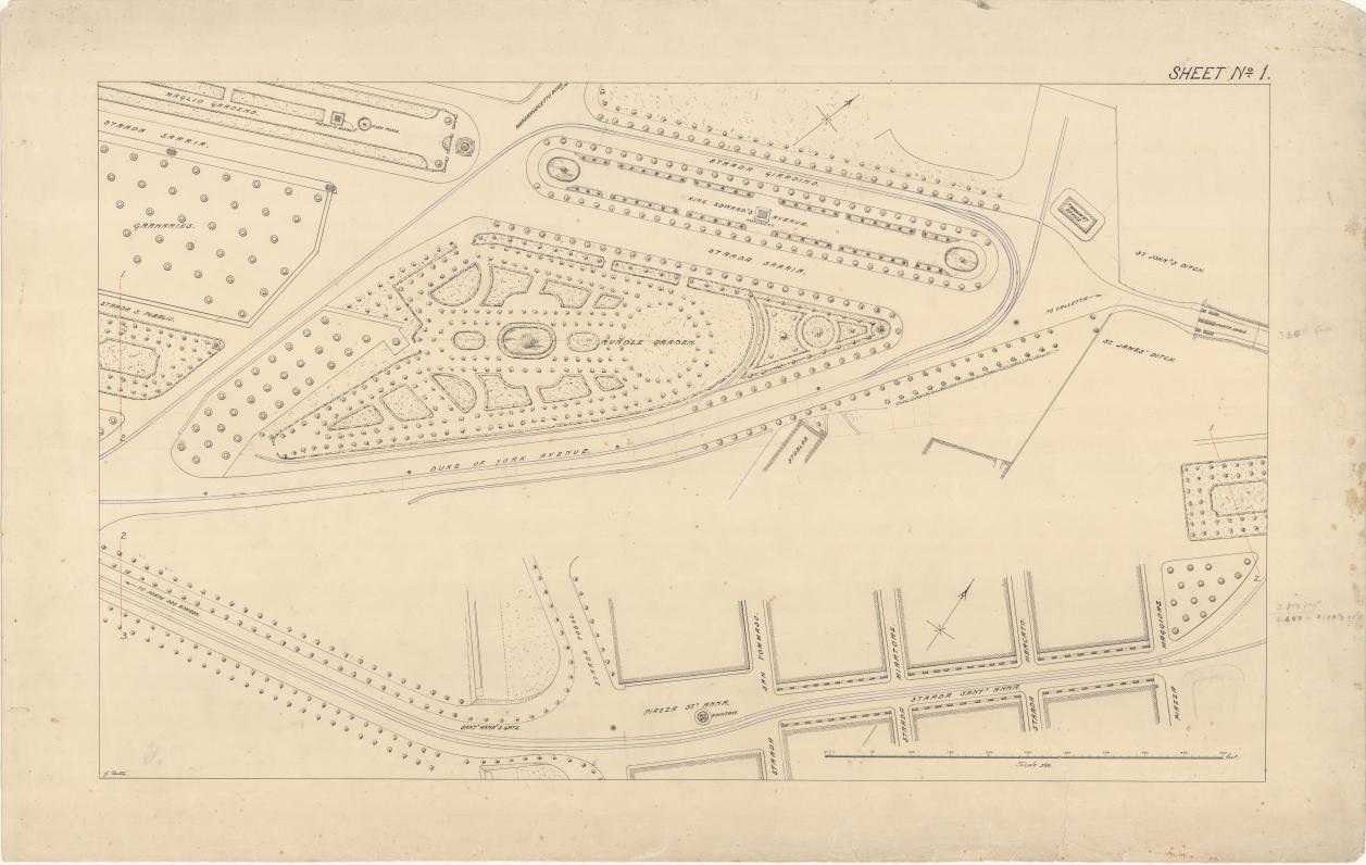 Plan of Floriana showing in blue the tramway carriageway along Strada Sant Anna, Duke of York Avenue and Strada Giardino.