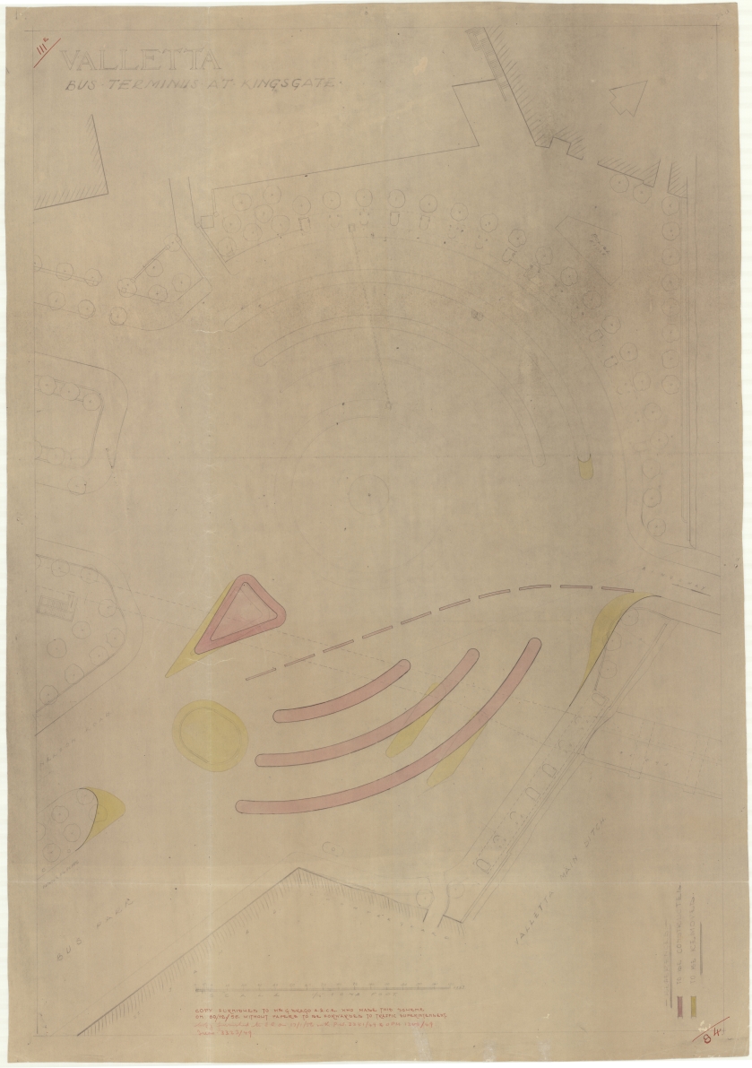 Plan of Kinsgate terminus in Valletta showing in red proposed modifications to be constructed and in yellow sections to be removed.