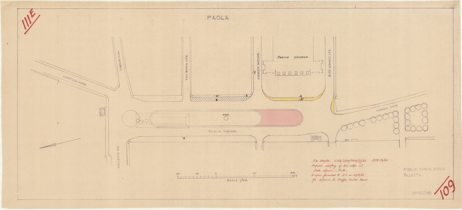 Plan of Paola square with proposed modifications showing in yellow and red shade and proposed shifting of bus stops showing as A, A1, B, C, C1, X and Y
