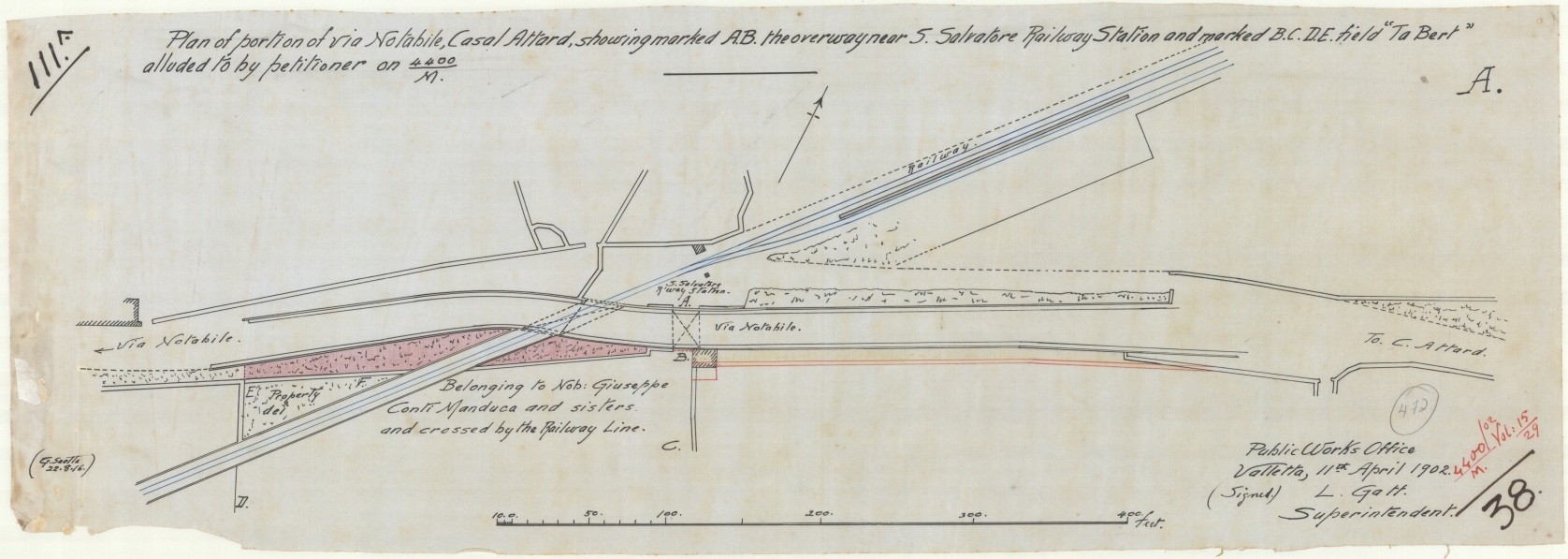 Plan of the portion of via Notabile, Casal Attard, showing marked AB the overway near St. Salvatore Railway Station and marked B.C.D.E. field, ta Bert, alluded to by petition on 4400- minute.