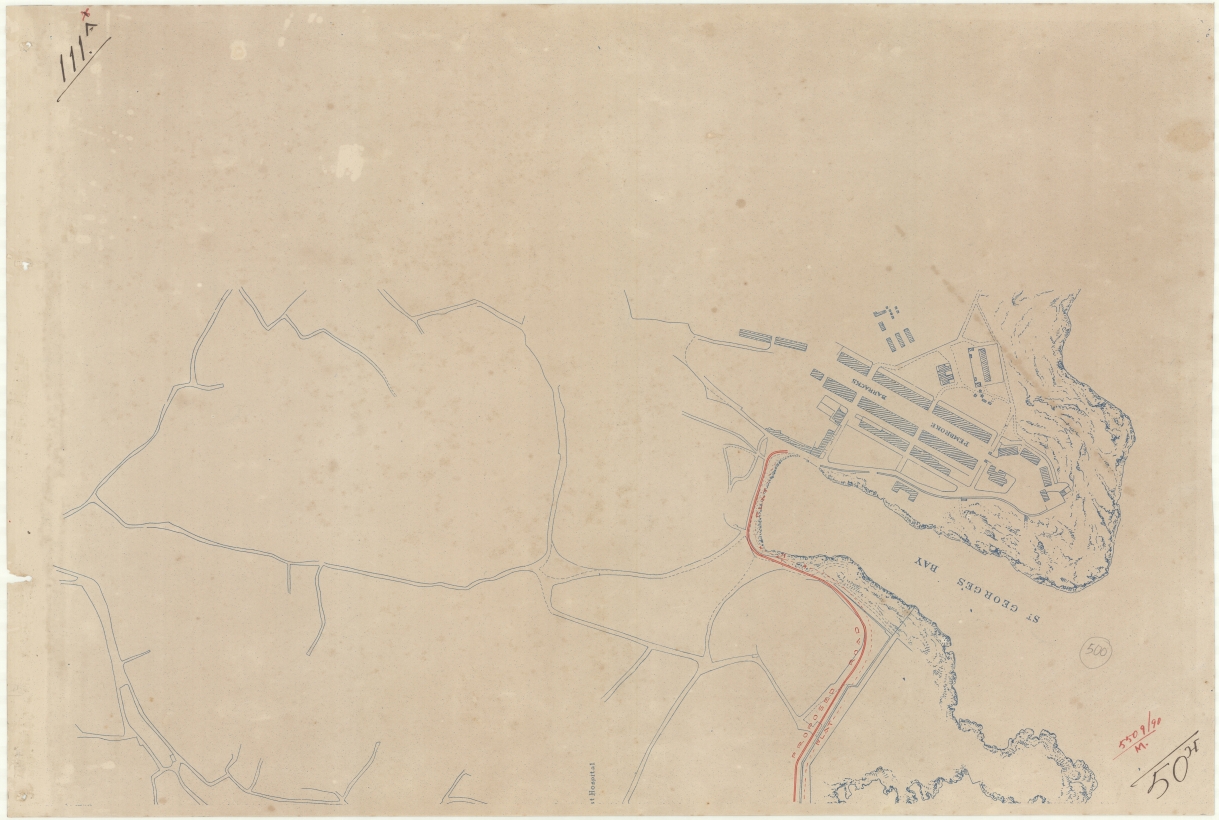 Plan showing in a red line the proposed route for a tramways to St. George s bay.