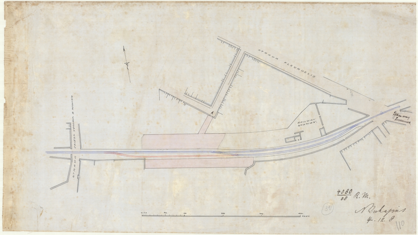 Plan showing in blue the tracks going towards Valletta and in red the tracks leading to the platform in the railway station in Birkirkara.