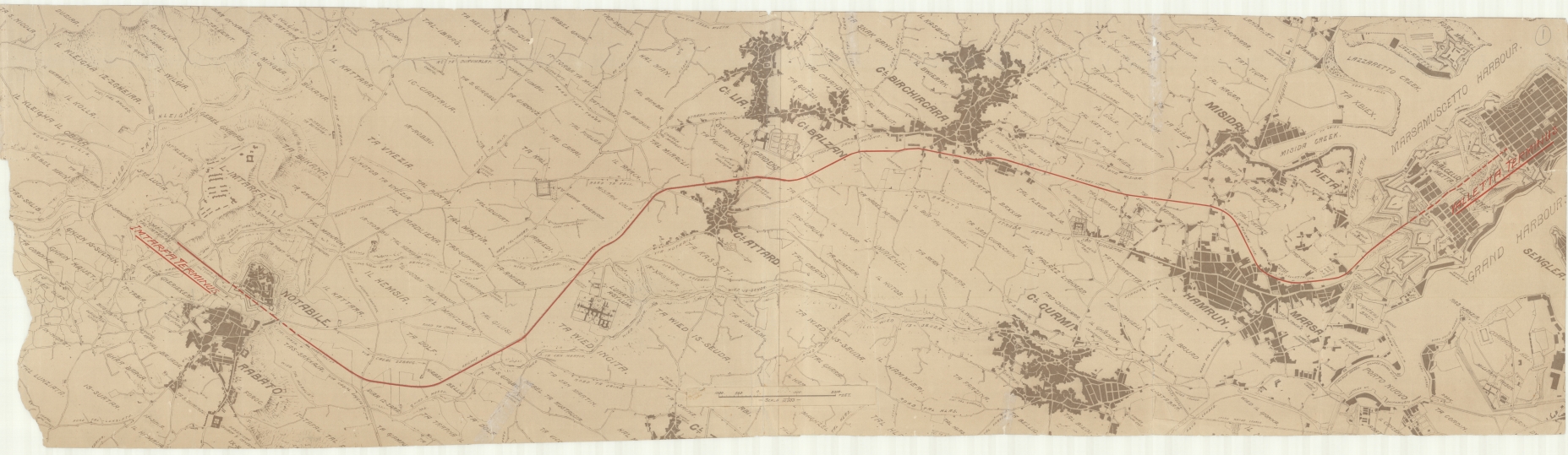 Plan showing in red line the railway from Imtarfa terminus to Valletta terminus.