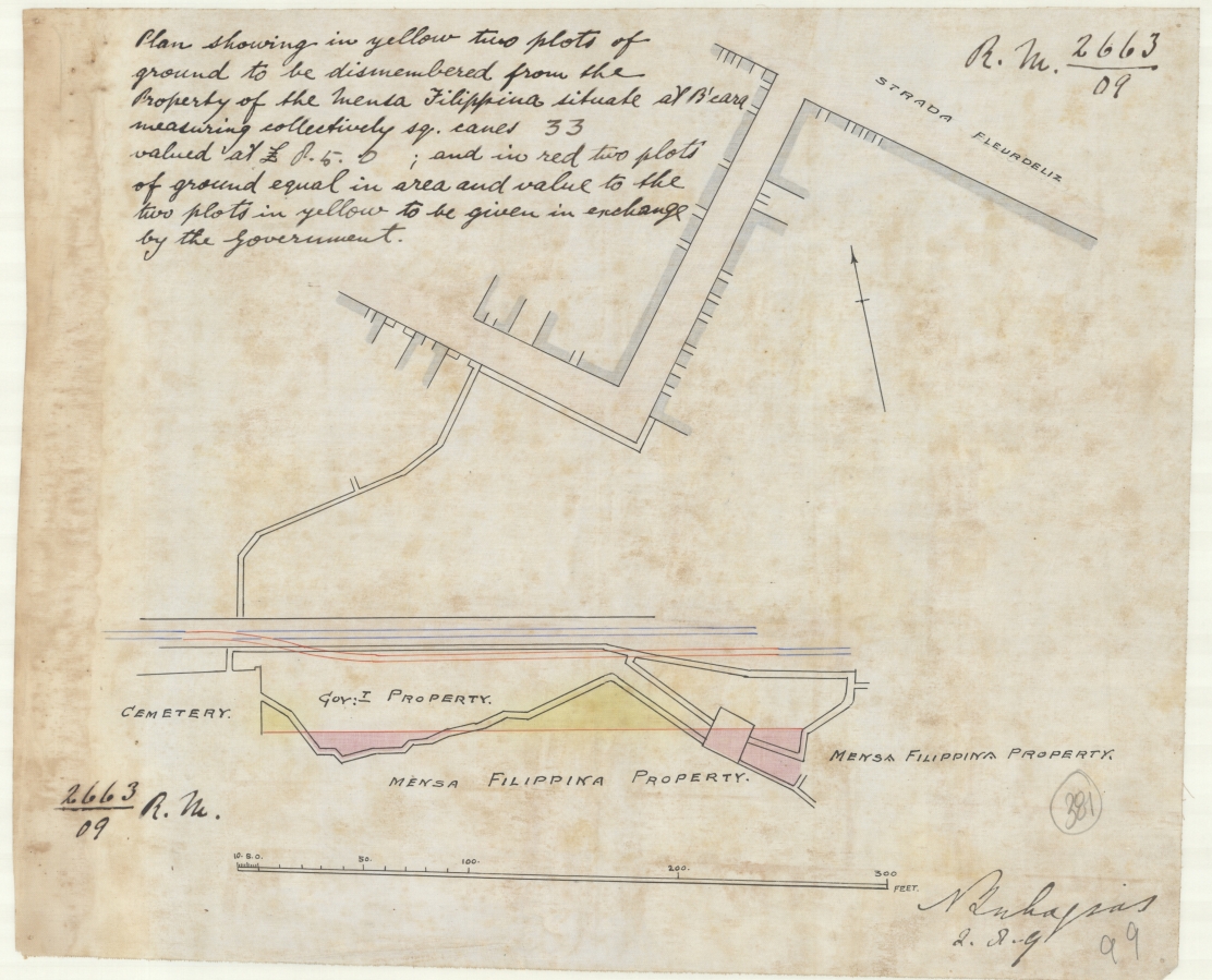Plan showing in yellow two plost of groung to be dismembered from the property of Mensa Filippina situated at B cara measuring collectively sq canes 33, valued at £5; and in red two plots of around equal area dna value to the two plots in yellow to be given in exchange by the Government.