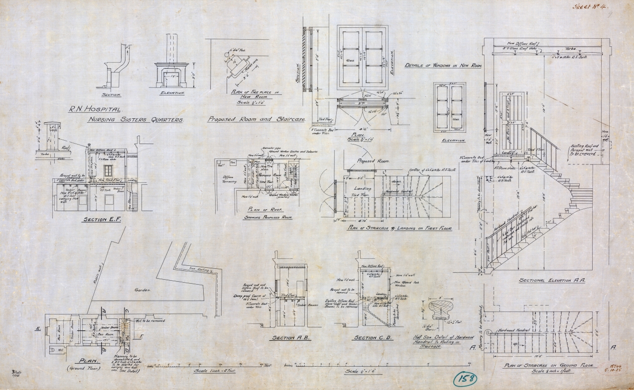 Dated 5/10/1925; Proposed Room and Staircase; Plans, sections, elevations; Sheet No. 4 in top left corner