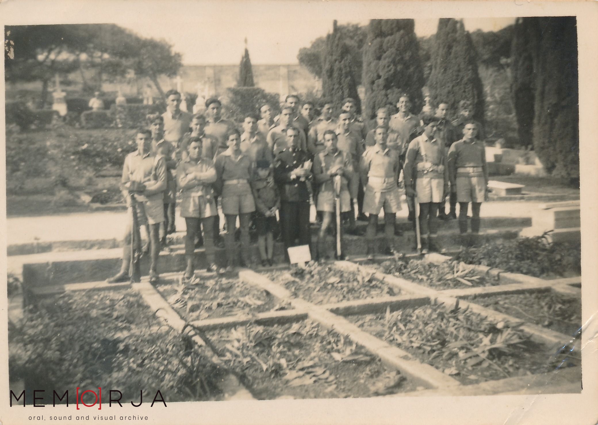 Gunner Vincent 'Censinu' Caruana (smiling, back row, third from right) posing with servicemen at First World War soldiers' graves.