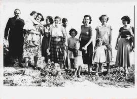 (From left to right) Rosa Salomone, Margaret Salomone, Mona Salomone, Dorothy Pizzuto, unidentified man, Loulou Pizzuto, Anna Salomone, Carmen Pizzuto and four children,