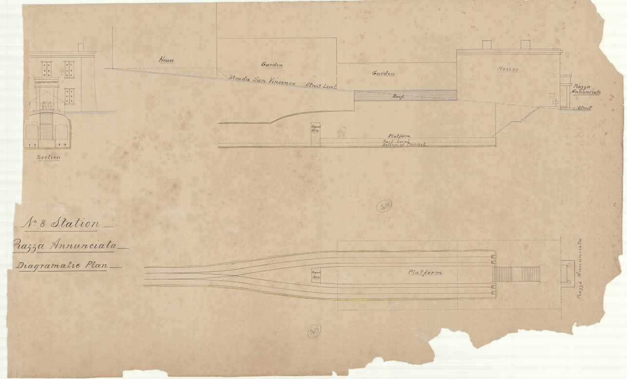 Diagramatic plan showing plan, elevation and section of Piazza Annunziata train station.