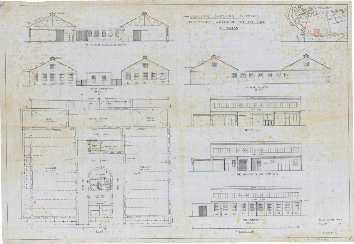 Drawing showing proposed carpenter s workshop for the P.W.D at Marsa. Plan, front, rear, side and part elevations, and section.