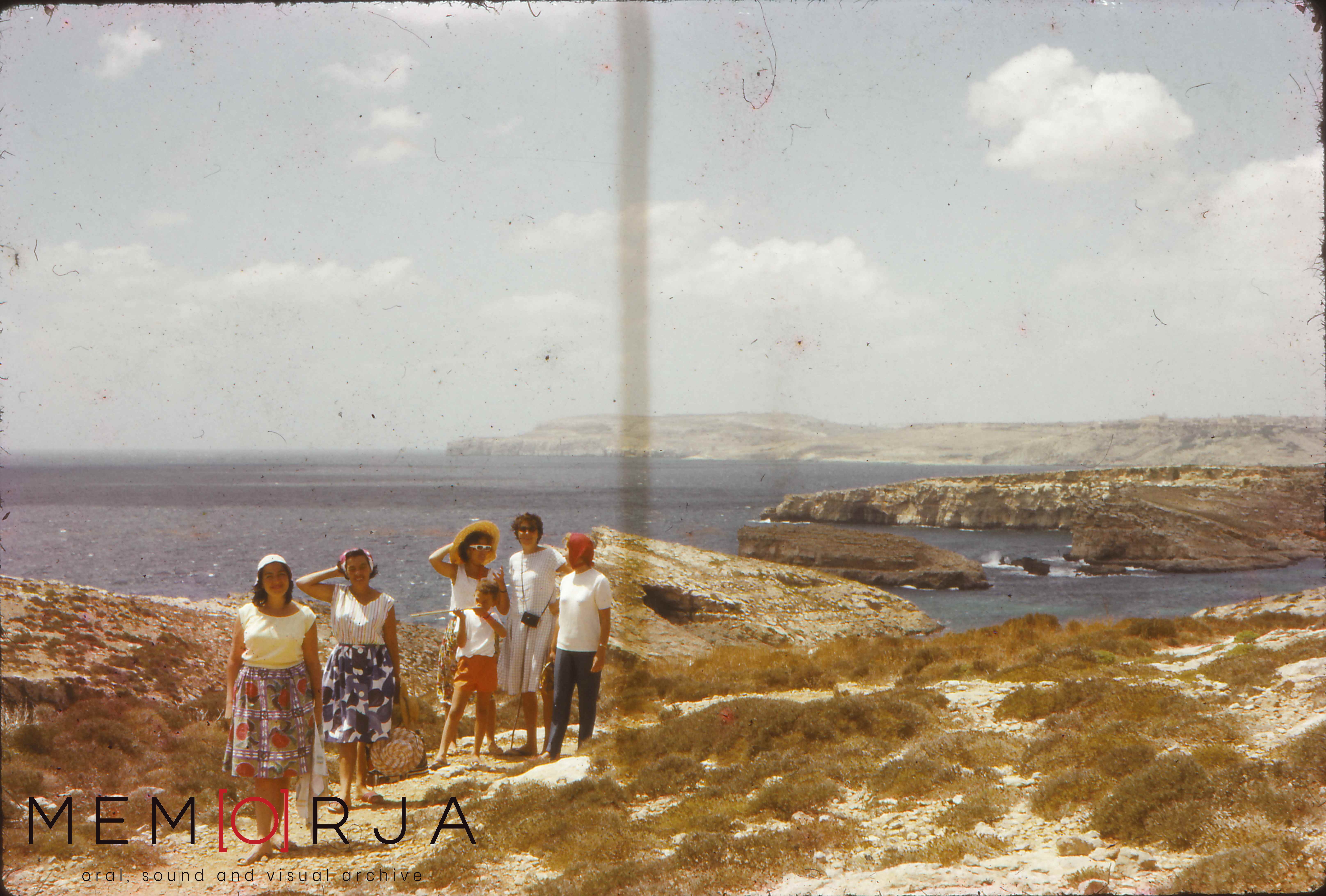 Carmen Pizzuto, Loulou Mifsud Bonnici (Carmen's elder sister) and Mark Mifsud Bonnici (Loulou's son) with three unidentified individuals.