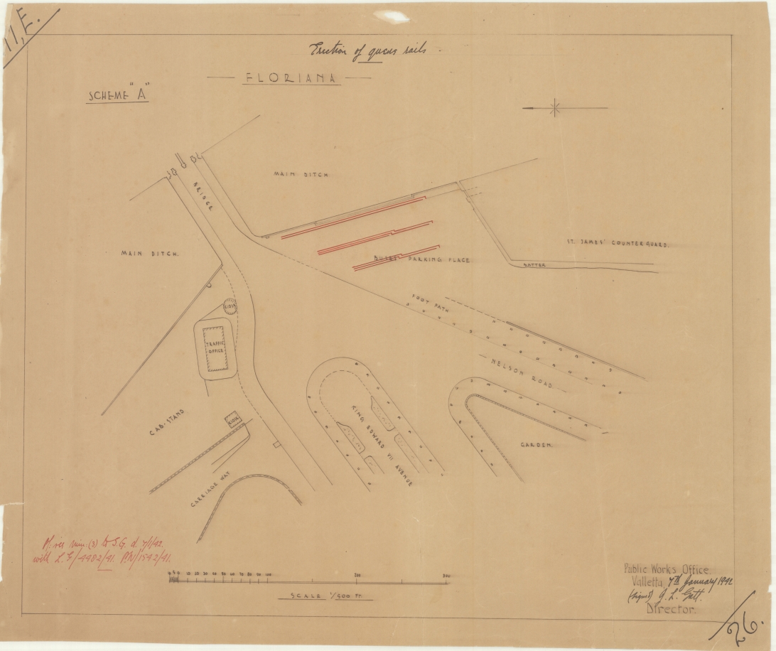 Floriana scheme A for bus parking adjacent to St. James counterguard. Includes referemce to files CSG d 7-1-42; L.S.-4482-41 and PW-1542-41