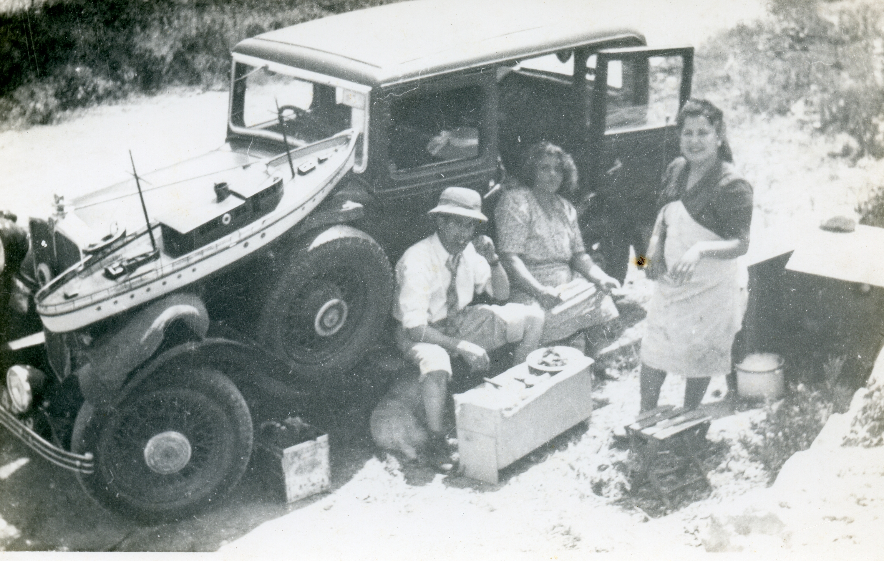 An unknown motor car (with a four digit number plate starting with a 4). A family are sitting and enjoying a picnic. A large model boat sits on the car's bonnet