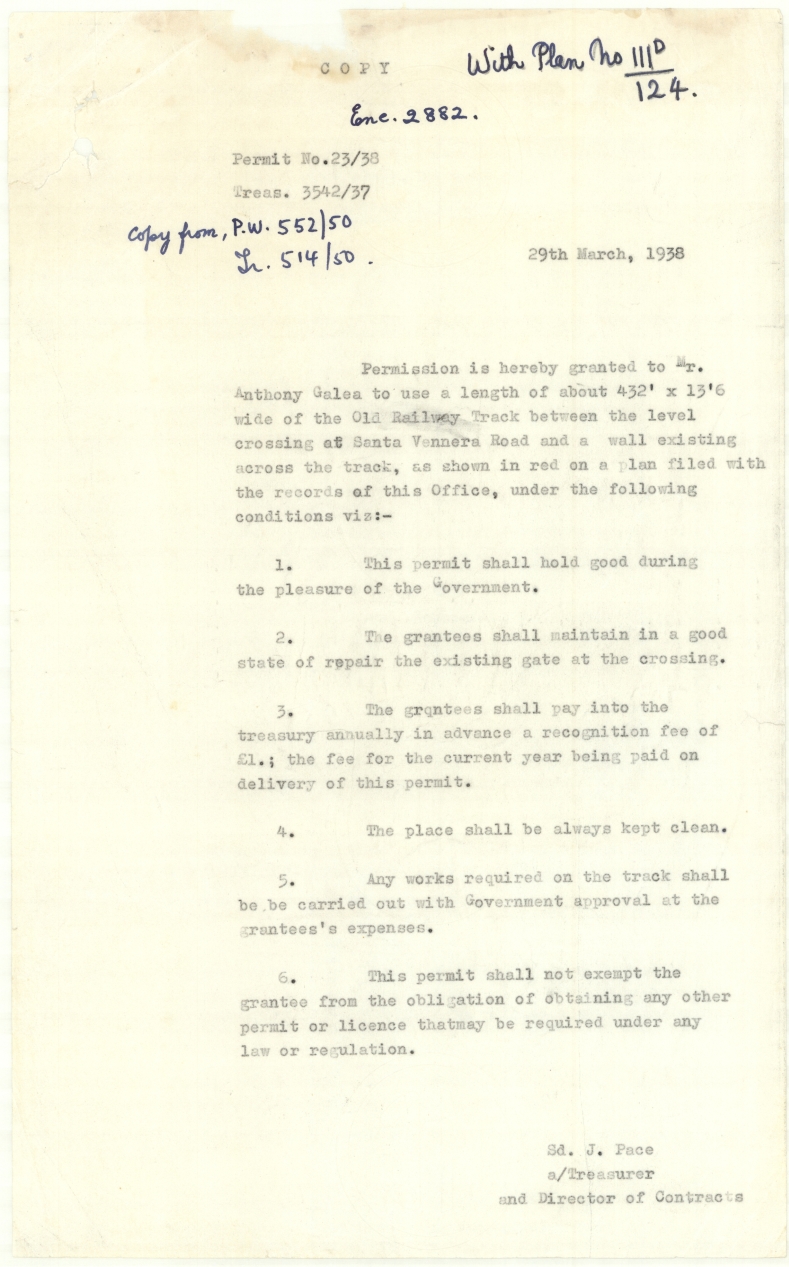 Grant of permission to Mr Anthony Galea to use part of the old railway track between the level crossing at Santa Vennera Road and wall existing across the track showing in PDM 62731. Page 2