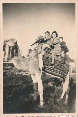 Jean (holding a toy rifle) and Maurice Despott with their mother Anne on a camel before departing for either Sabratha or Benghazi.