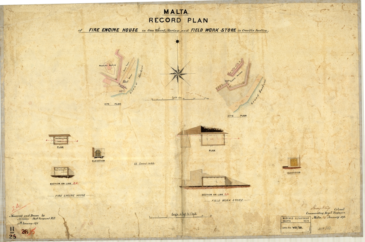 Malta Record Plan - of Fire Engine House on Gun Wharf, Marina and Field Work Store in Crucifix Bastion
