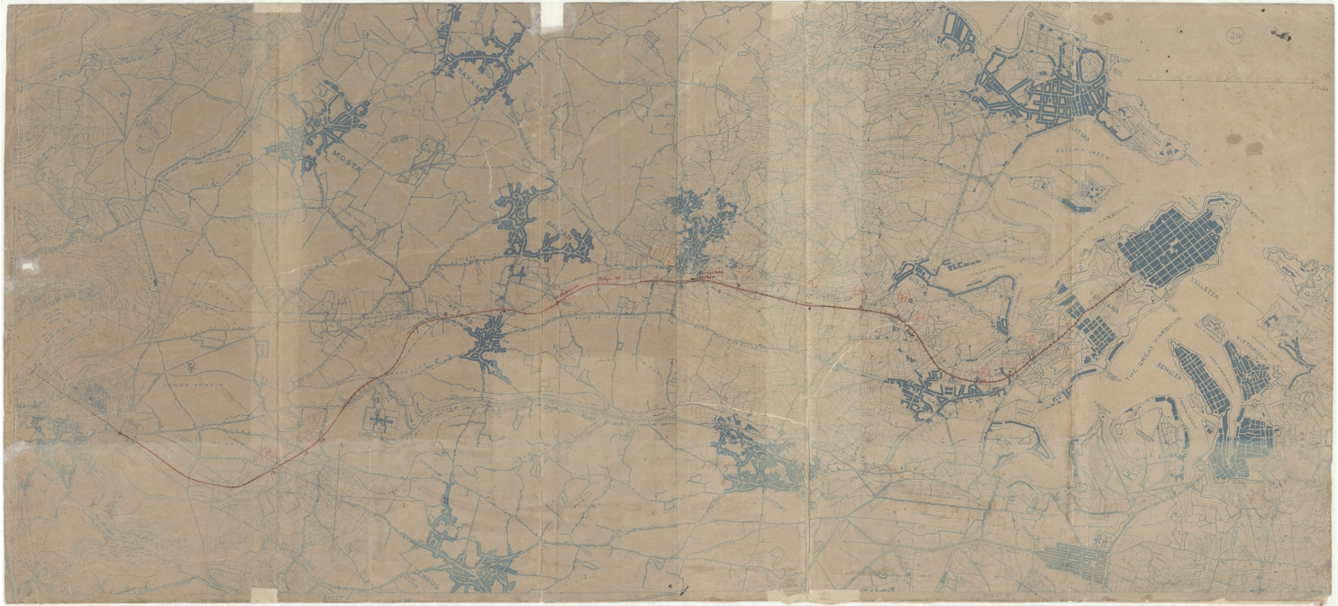 Map of Malta showing in red line the train line from Notabile station through Attard, Birchircara, Misida and Hamrun to Valletta terminus.