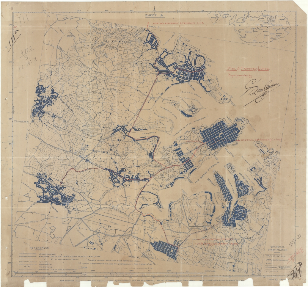 Map of proposed tramways joining Qormi (Curmi- , Hamrun, Sliema and Paola to Valletta shown in red - detail in map shows buildings, lands owned by government or private and geological stratification - including eventual extensions to Pembroke camp, in a loop in Valletta and to HM Dockyard French Creek.