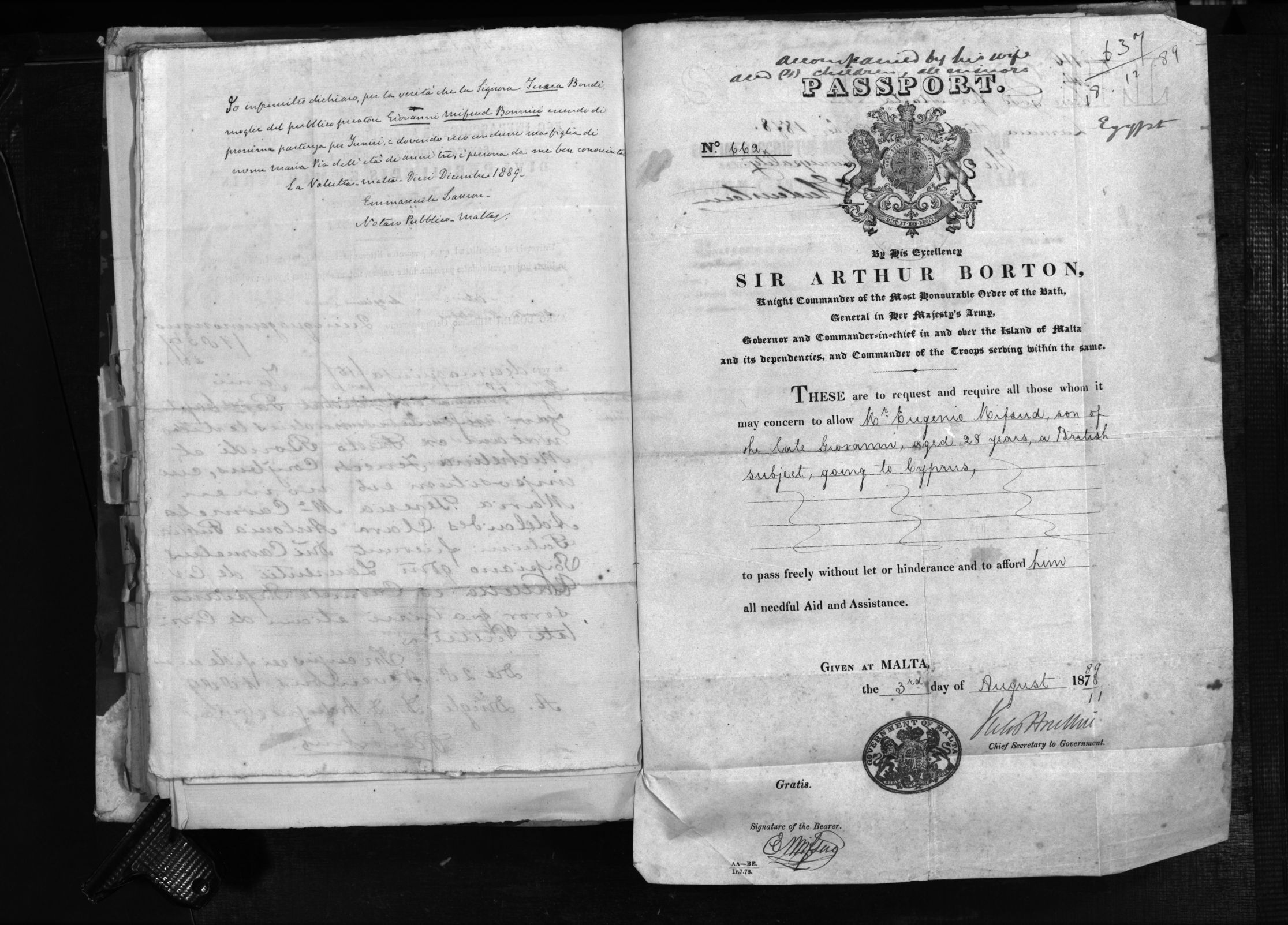 Son of the late Giovanni, DOB N/A, Age 28, Occupation not stated, Town, Village, Parish N/A, Destination Egypt, Remarks: Accompanied by his wife and four (4) children all minors