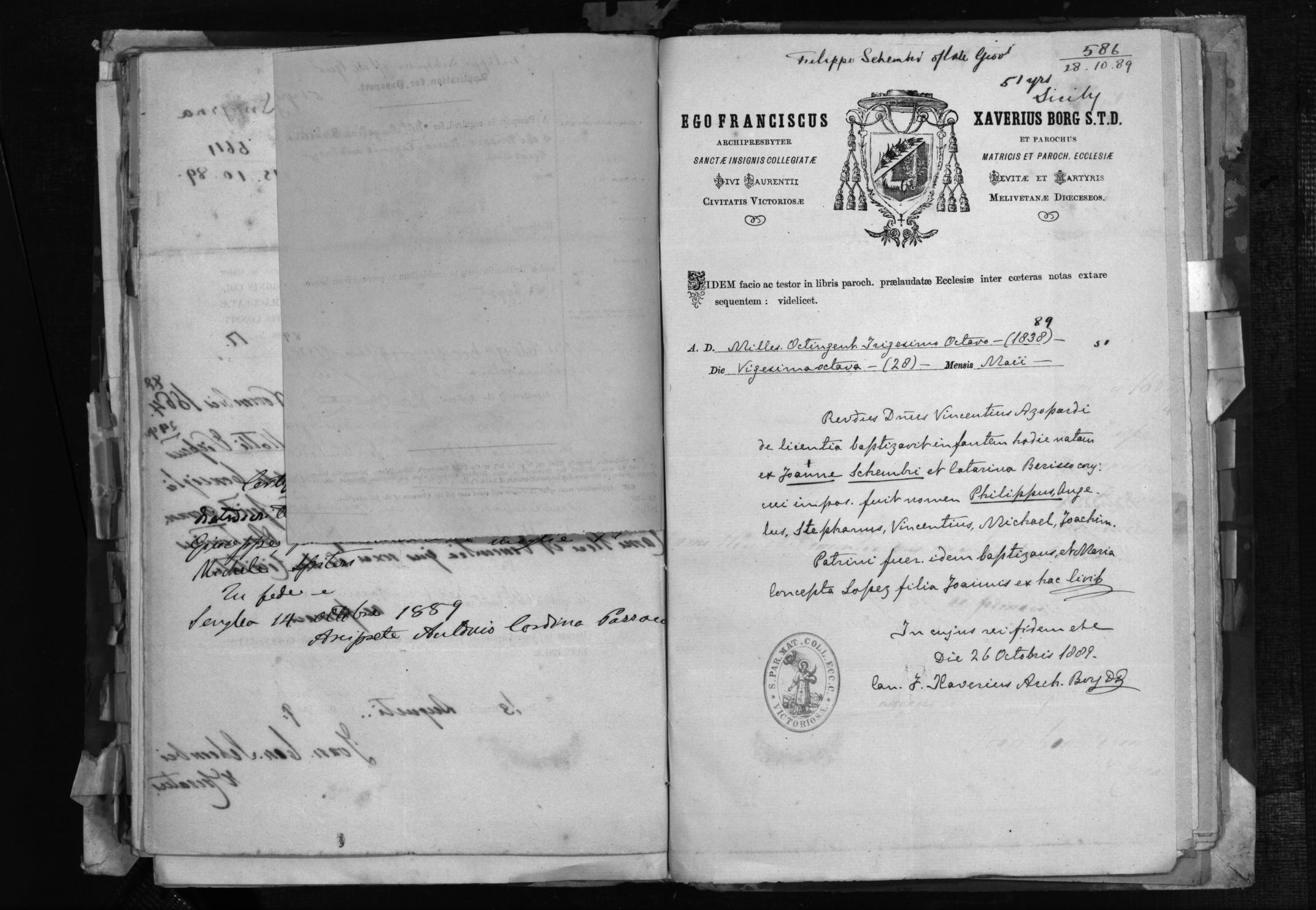 Son of the late Giovanni, DOB 28/03/1838, Age 51, Occupation not stated, Town, Village, Parish Birgu, Destination Sicily, Remarks