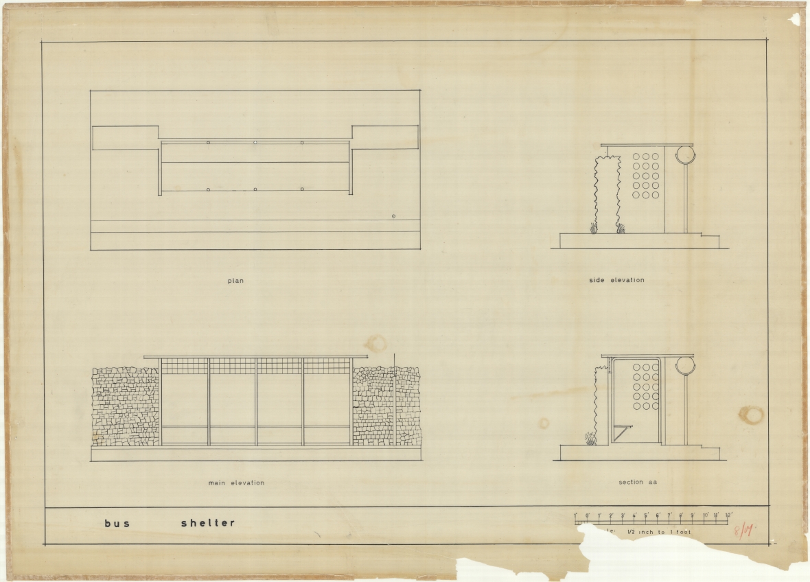 Item 63744 - Plan, main and side elevation and section of proposed bus shelter