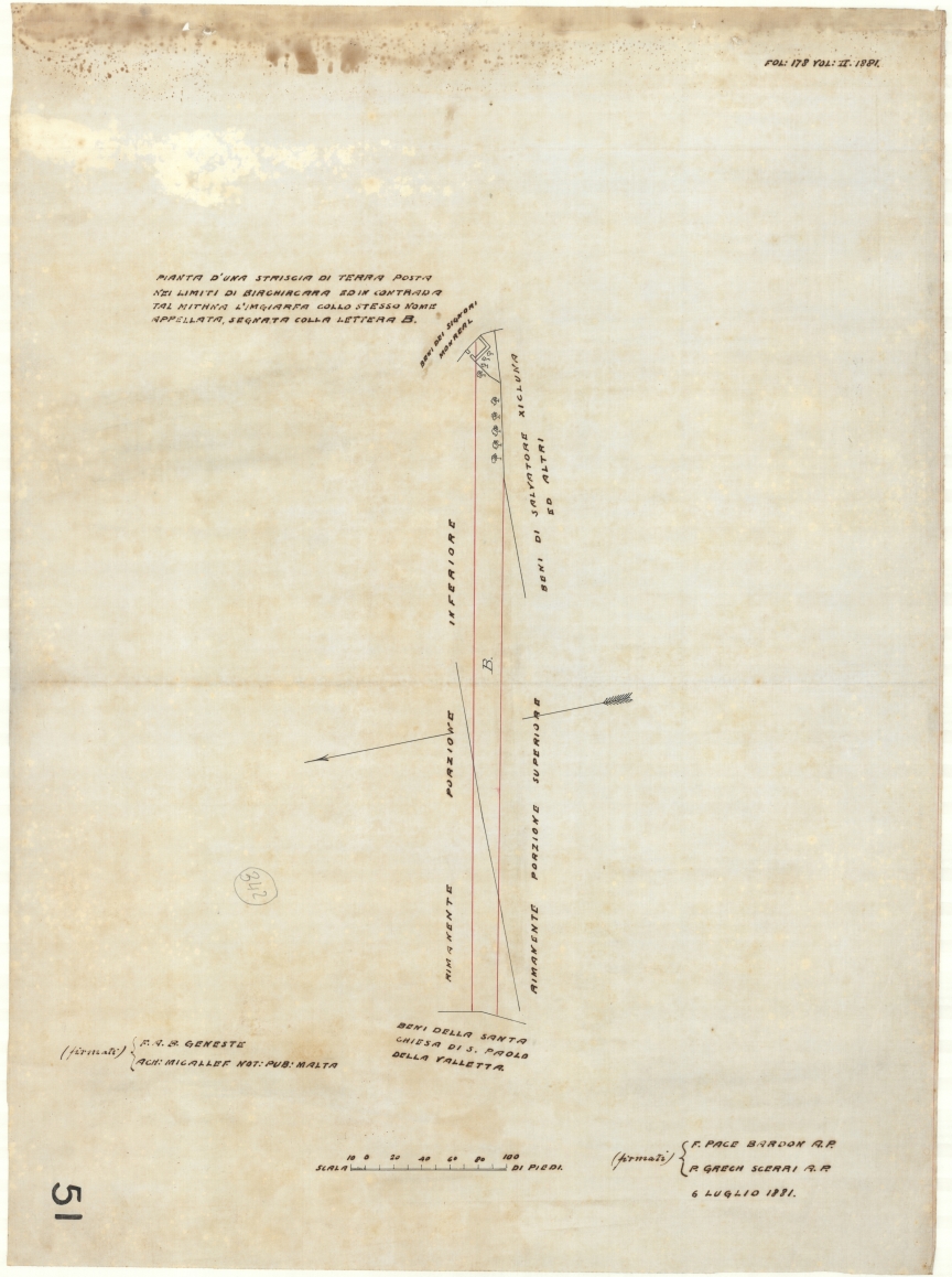 Plan of a strip of land at the limits of Birchircara in Tal-Mithna l Imgiarfa Road, named as same showing marked with the letter B. Reference Folio 178 Vol II 1881.
