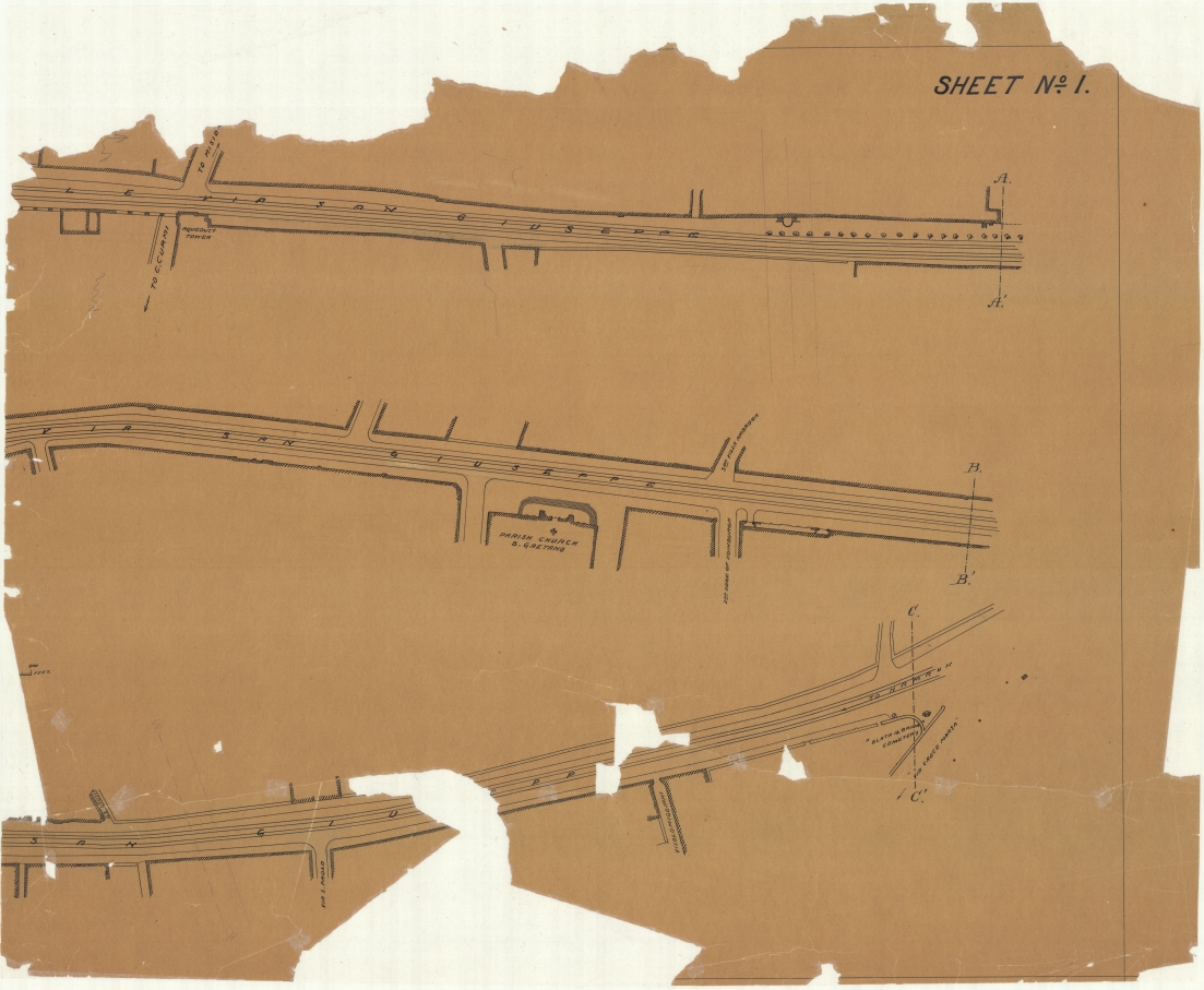 Plan of different section of rail road in strada Reale via san Giuseppe Hamrun - Part 1 - damaged, various missing parts.